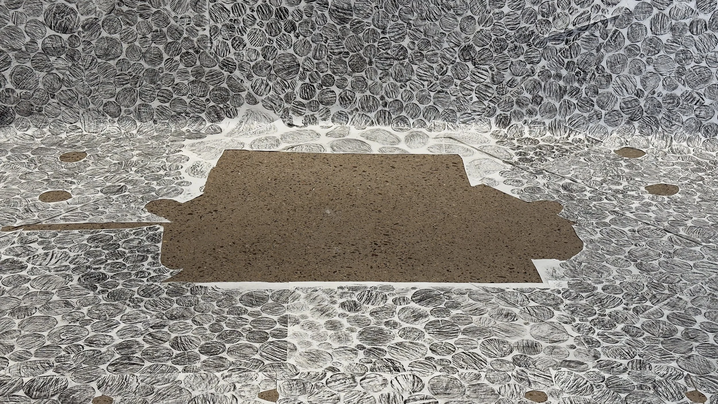Detail, Barn Floor Rubbing: the gap in the rubbing - where the open fireplace backed onto a wood stove & the hot water tank that a possum lived on top of.