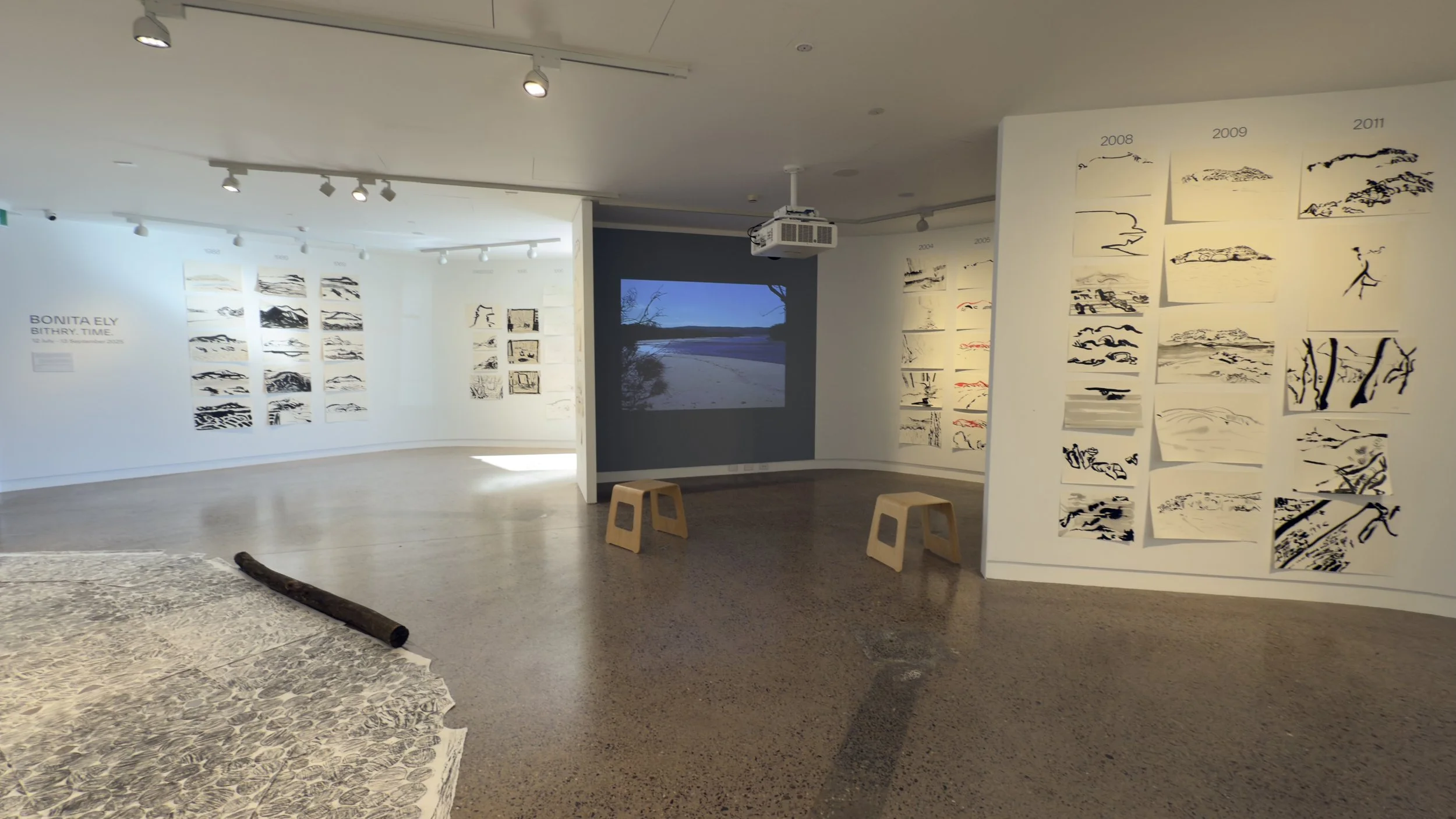 The floor rubbing opposite time lapse videos combined with real time footage on wall 3, titled Bithry Inlet Summer Dawn to Dusk and Bithry Inlet Winter Dawn to Dusk.