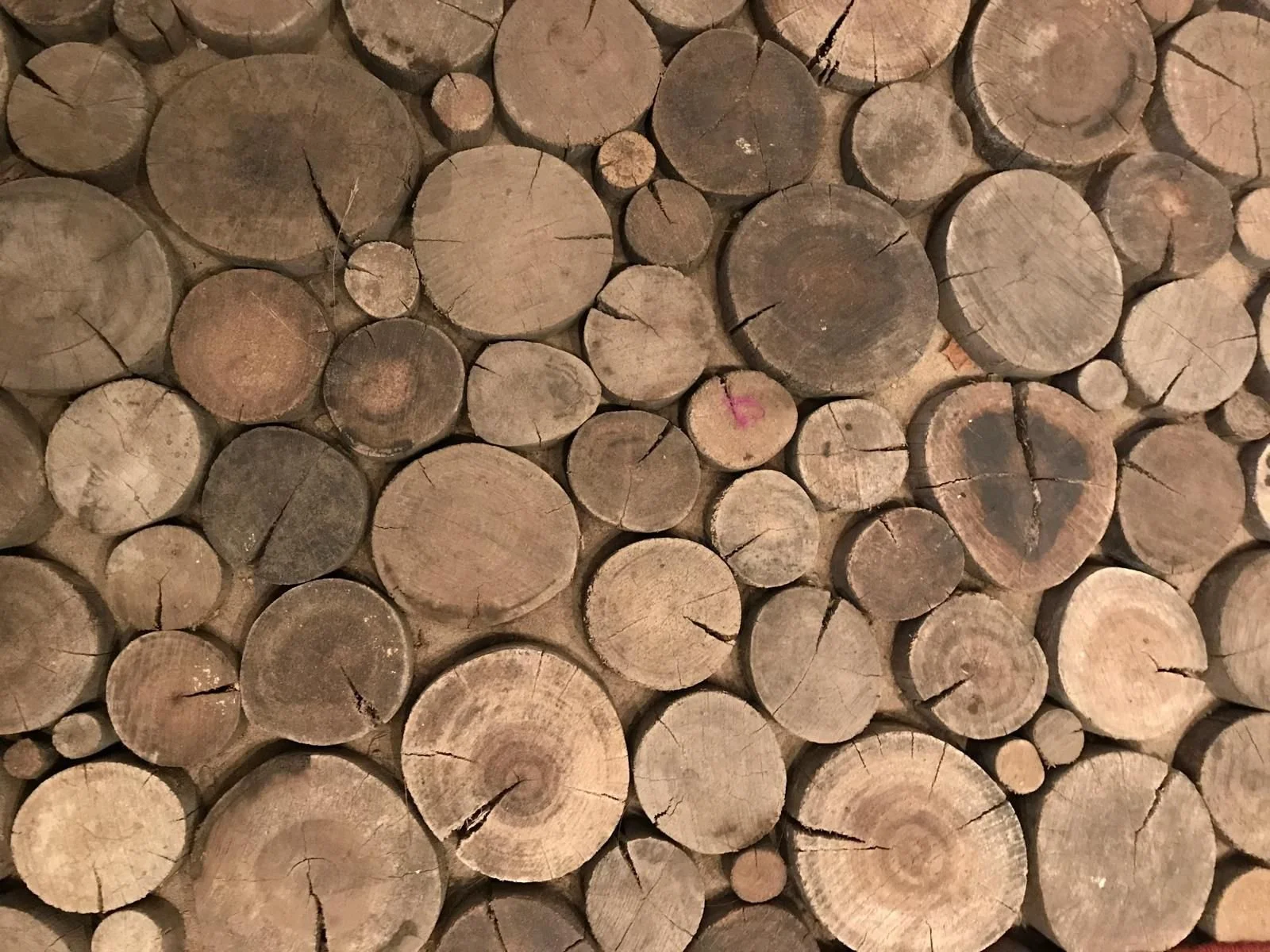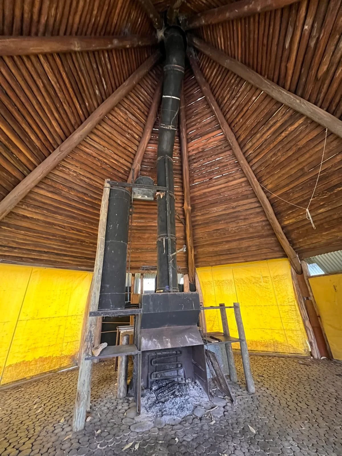 Interior of the Barn - its roof structure: small logs at the top rest on progressively bigger logs which are held in place, pressed between the corrugated iron roof and the nine long, sloping, vertical logs meeting in the centre, surrounding the chimney. On the floor, small stubs of wood (~10cm) are held vertically in sand. Water is heated by plumbing along the back of the open fireplace. The wood was treated in a wood preservation plant, a project experimenting with the tanalith wood preservation process to preserve eucalyptus, jointly established with Ken Myer.