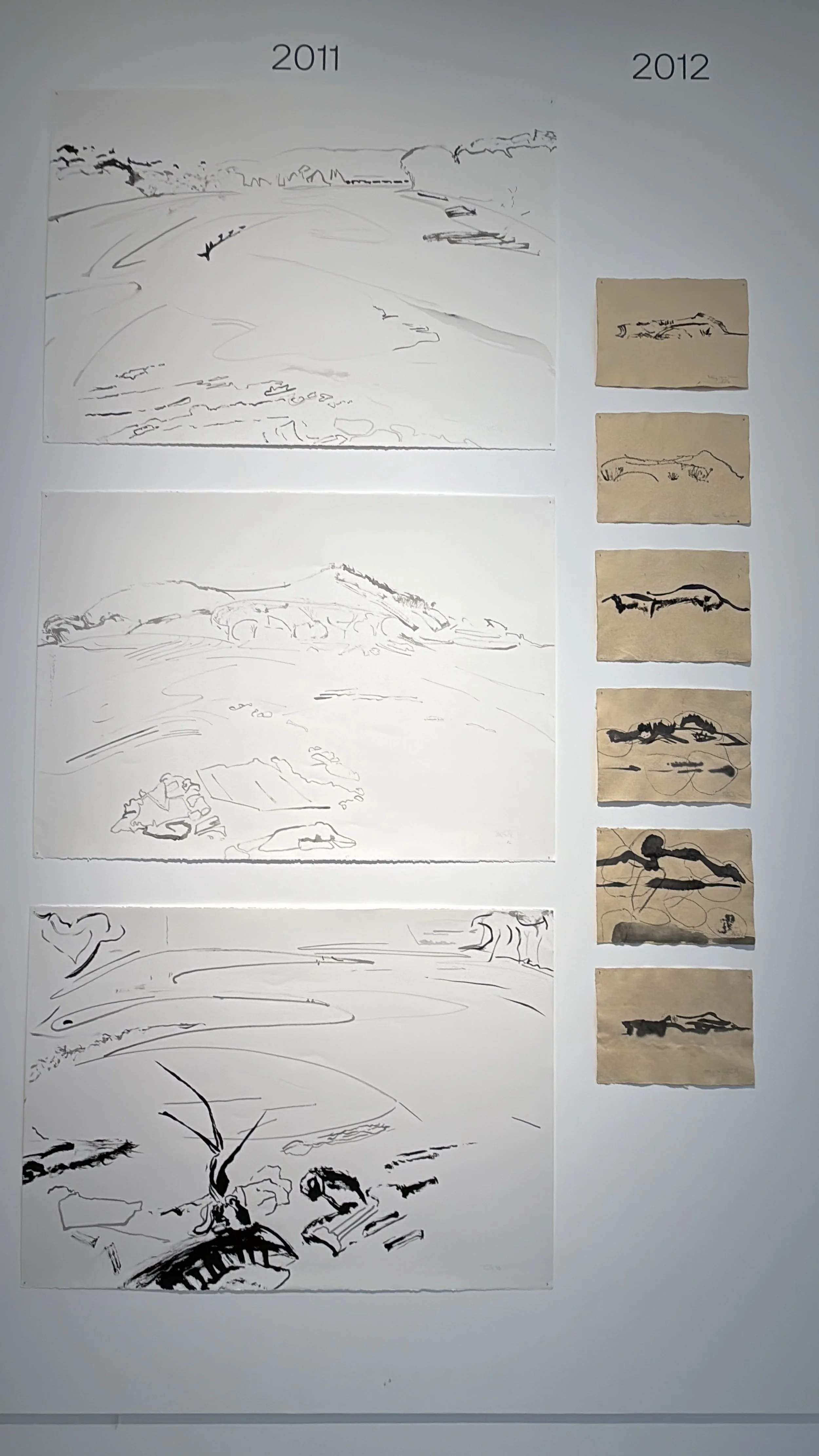 Wall 7, 2011, Left, the estuary, ink on watercolour paper; 2012, right, ink on Vietnamese rice paper.