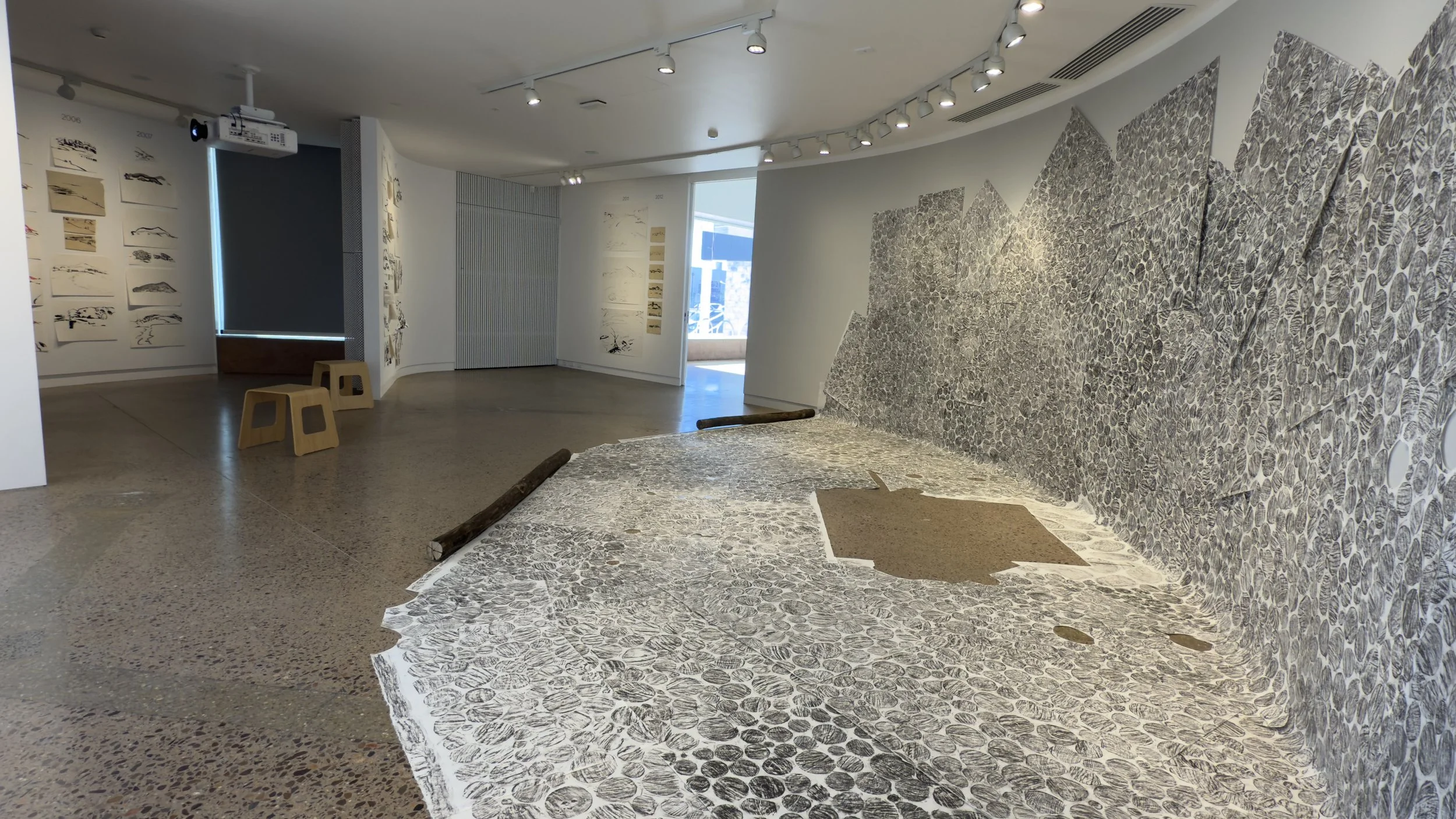 Columns of works on paper & videos in ‘nooks’, opposite the long, horizontal rubbing.